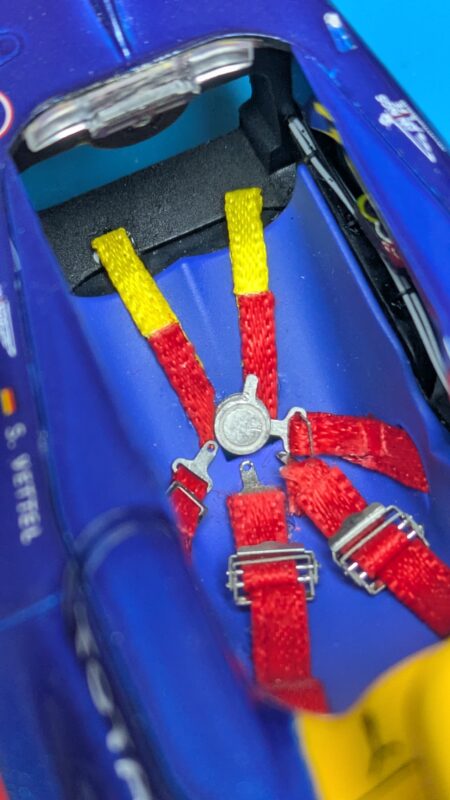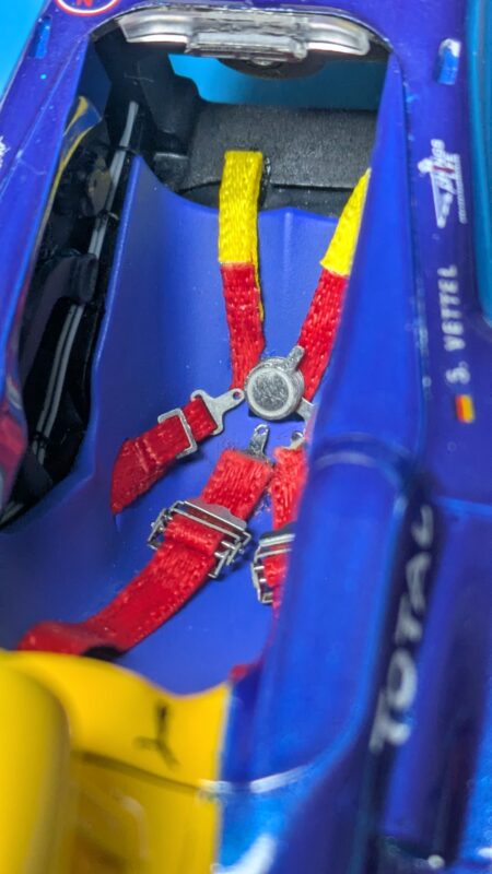 シートベルトは接着になります。ベルトは布製ですが実物の様に垂れ下がったりしないのでここは接着しました。また、布製なのでピンセットなどであんまり触っているとベルトがほつれてきますので注意が必要です。